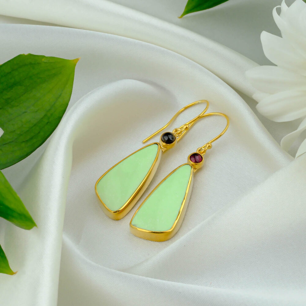Krizopraz (Krizoplas) ve Garnet (Lal) Doğal Taş Gümüş Gold Küpe