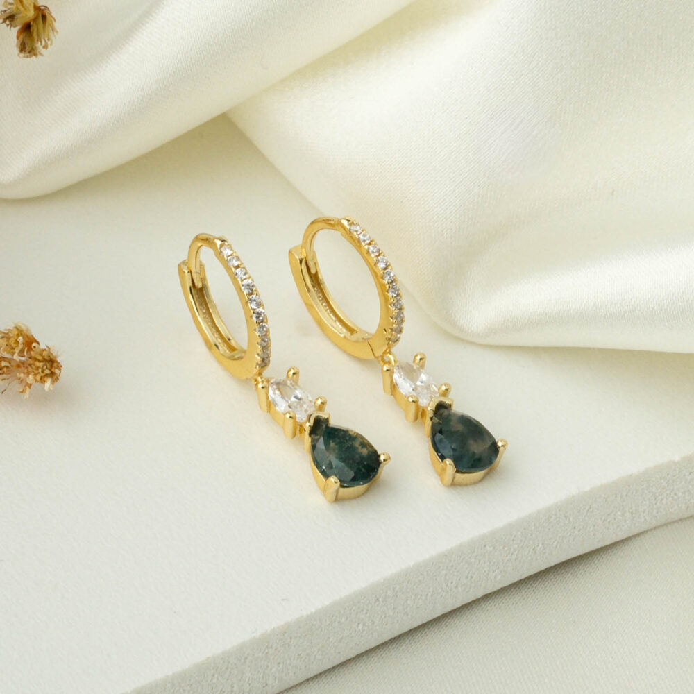 Moss Agate (Akik) Doğal Taş Gümüş Gold Bayan Küpe