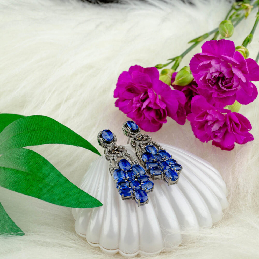 Orijinal Natural Safir-Kyanit ve Elmas Doğal Taş Gümüş Küpe