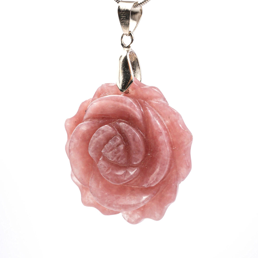 Gül Model Oyma Pembe Kuvars Taşı Metal Kolye (Küçük)