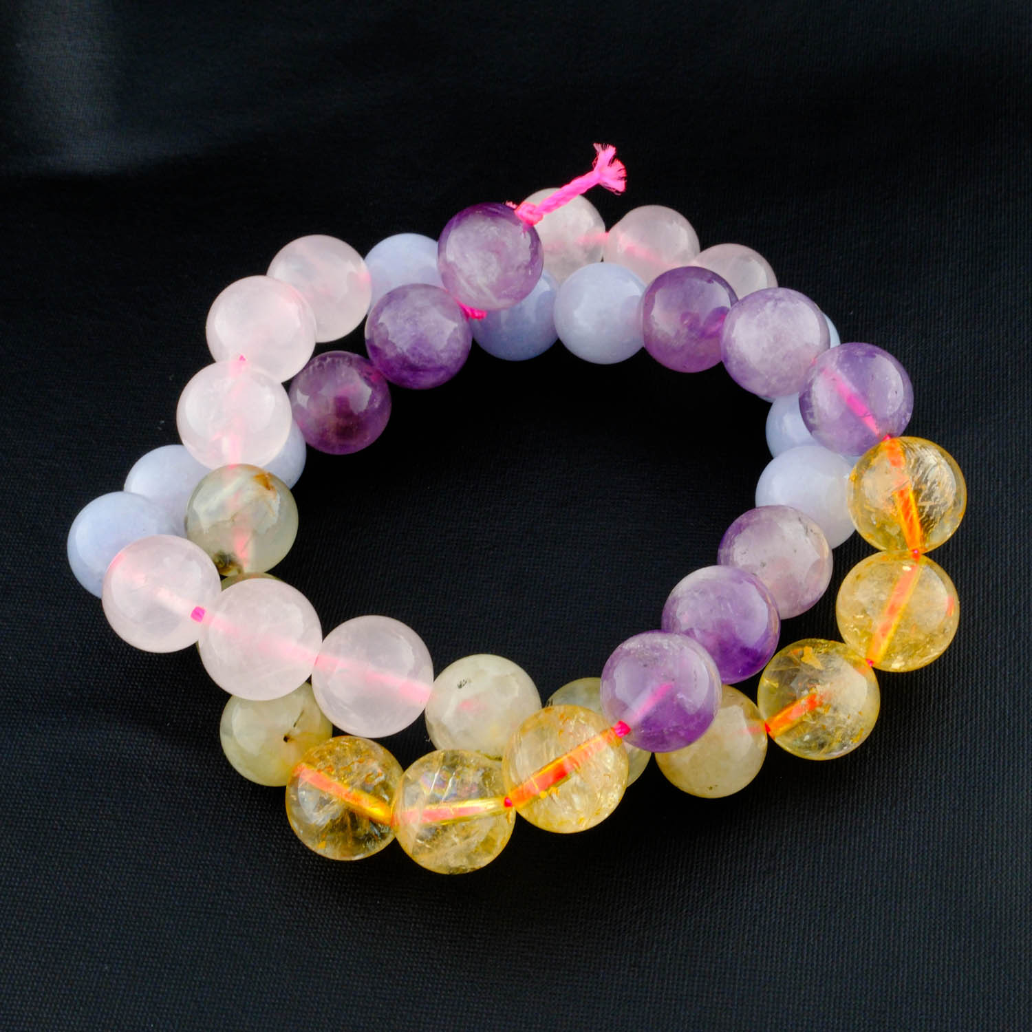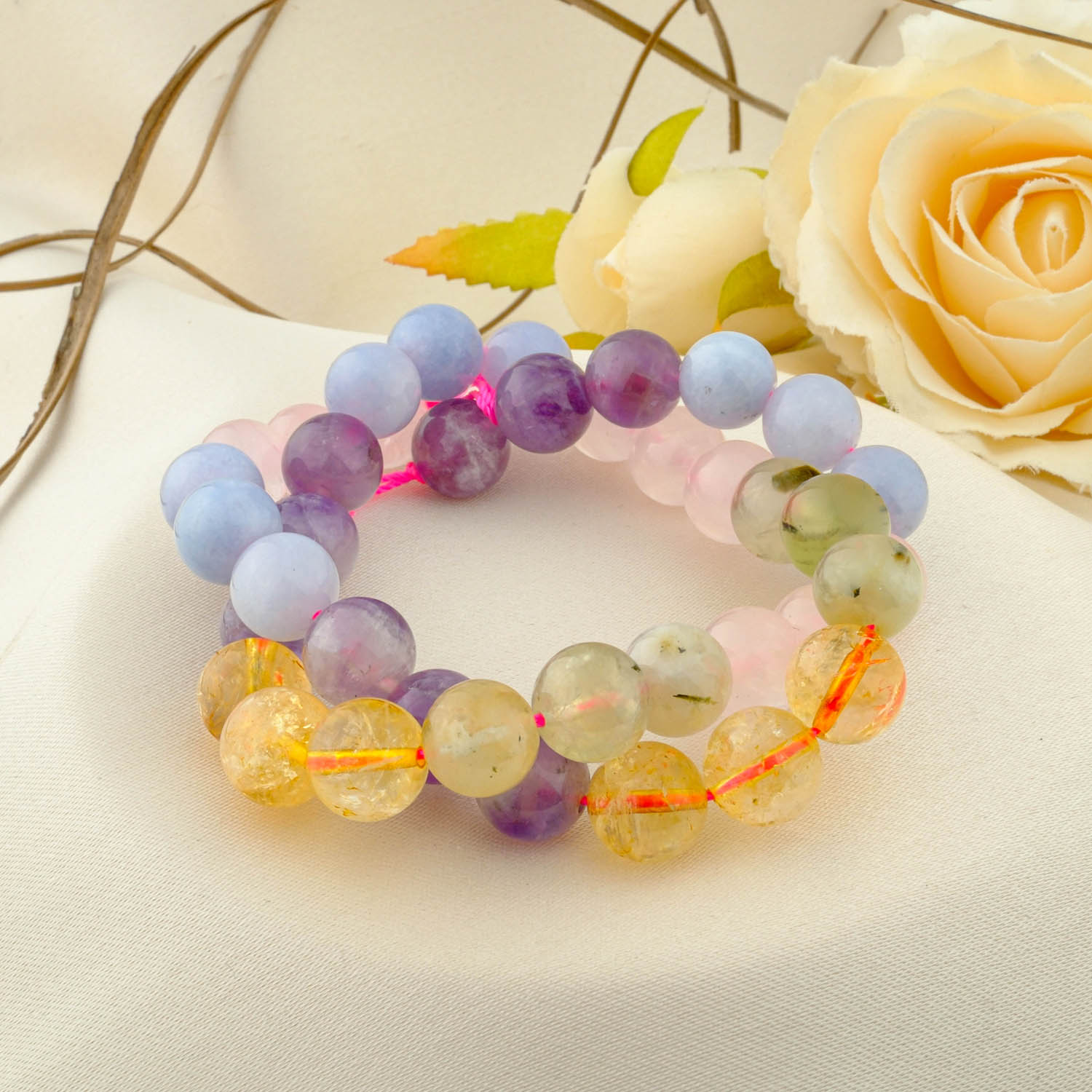 Bu doğal taşlar dizildiğinde, bedensel ve ruhsal dengeyi sağlamaya yardımcı olur. Pembe kuvars, sevgi ve barış yayarken; akuamarin ve prenhite, zihni sakinleştirip sezgileri artırır. Sitrin, enerjiyi yükseltirken, ametist ise ruhsal koruma ve stres azaltmada etkilidir.
