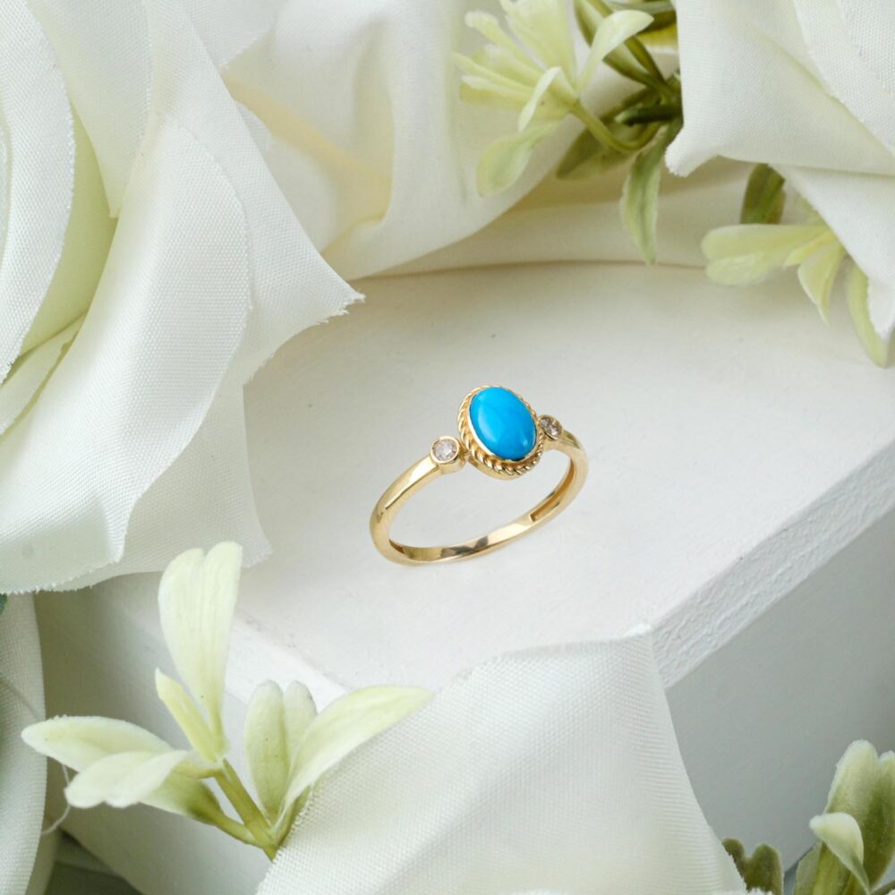 Orijinal Turkuaz (Firuze) ve Pırlanta Süslemeli 14 Ayar Altın Yüzük
